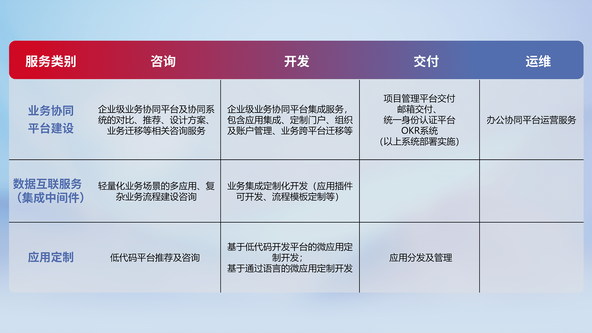 针对钉钉、、企微、、、IDaas等平台级产品提供产品的规划、、、方案、、交付、、、、定制化开发等服务,,实现如统一协同办公、、、智能客户服务、、、混合会议管理、、、、智能数据查询、、等业务场景,,实现数字化转型。。。。